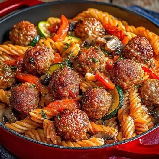 Pâtes aux Boulettes Gourmandes et Légumes en Sauce