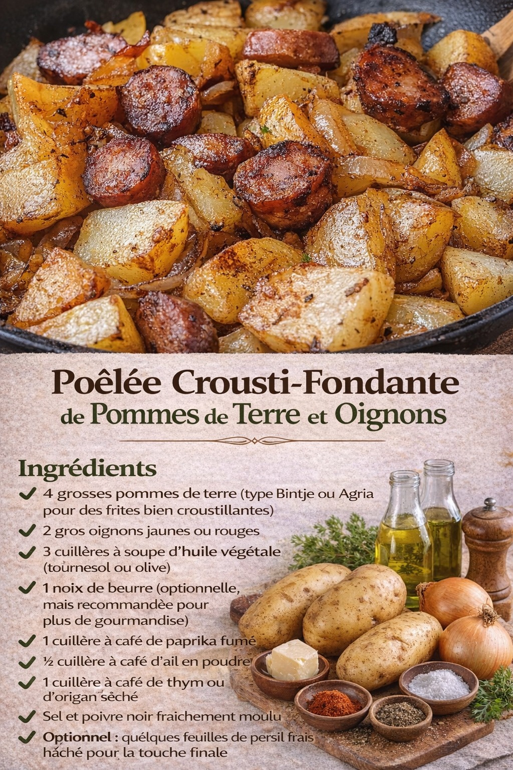 Cette poĂȘlĂ©e met Ă lâhonneur le duo mythique de la cuisine rustique : pommes de terre frites + oignons caramĂ©lisĂ©s, relevĂ©s dâherbes et dâĂ©pices pour un maximum de saveur.