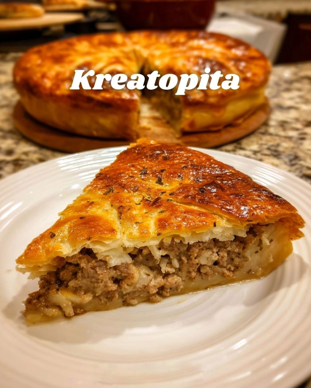 Une savoureuse tourte grecque Ă la viande, composĂ©e de couches de pâte filo feuilletĂ©e et d’une gĂ©nĂ©reuse farce de viande hachĂ©e Ă©picĂ©e.