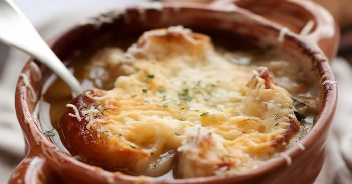 Oignons longuement caramélisés, bouillon corsé et gruyère fondant
