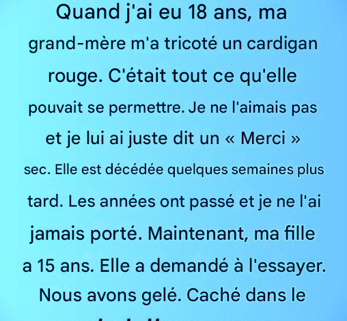 Une jeune femme a hérité d'un cardigan rouge de sa grand-mère. Des années plus tard, sa fille y a découvert des billets de concert cachés : un amour transmis discrètement, qui ne demandait qu'à être découvert.