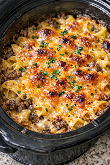 Ce gratin de bœuf et nouilles crémeux à la mijoteuse est le plat idéal pour les soirs où l'inspiration manque. C'est un mélange parfait entre un bœuf Stroganoff et la magie d'un jour de flemme : des nouilles fondantes, du bœuf savoureux et une sauce onctueuse aux champignons, le tout dans une seule casserole, avec un minimum de vaisselle.