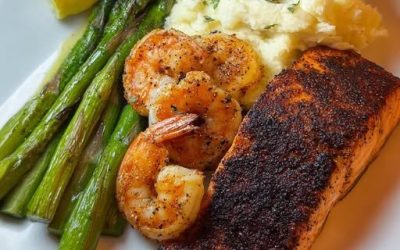 Saumon Épicé, Crevettes Sautées et Purée Maison avec Asperges – Un Plat Complet et Réconfortant