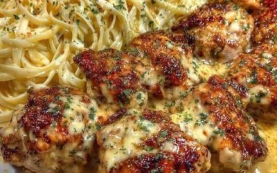 Ajouter la crème et le poulet : Incorporer lentement la crème pour obtenir une sauce onctueuse. Remettre le poulet doré dans la poêle et l’enrober de sauce. Saler et poivrer.