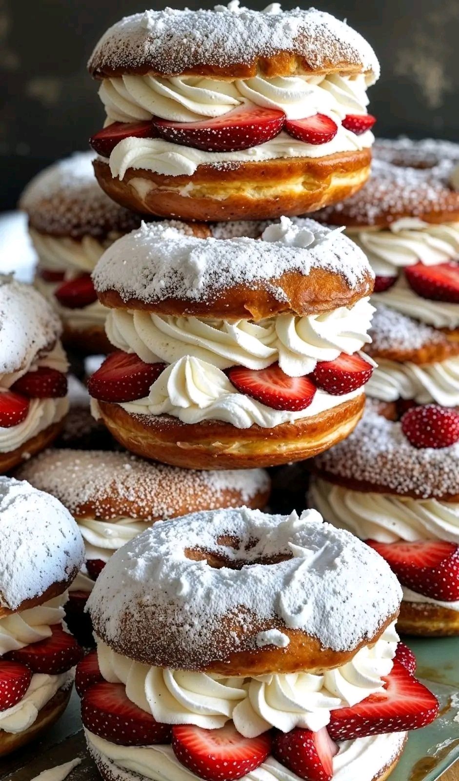Légers et aérés, ces petits choux sont remplis de chantilly onctueuse et de fraises fraîches, créant une combinaison parfaite entre douceur et fraîcheur.
