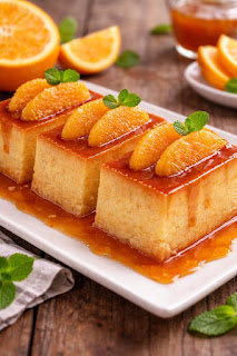 Ingrédients pour la préparation d'un flan au jus d'orange.