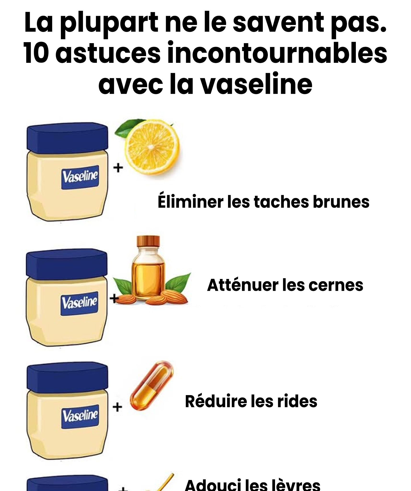 On la reconnaît entre mille, ce petit pot emblématique souvent oublié au fond d’un tiroir de salle de bain. Longtemps réservée aux lèvres sèches, la vaseline cache en réalité bien plus de talents qu’on ne l’imagine. Simple, économique et rassurante, elle traverse les générations sans prendre une ride… et ma grand-mère avait déjà compris qu’elle pouvait servir à bien plus que ce qu’on nous a toujours dit. Voici 10 astuces futées, avec les bonnes quantités, que beaucoup de gens ignorent encore.