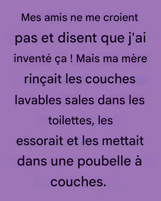 Les parents d'aujourd'hui ont accès à des technologies incroyables : poubelles à couches autonettoyantes, couches jetables parfumées, bandelettes changeant de couleur. Ma mère n'avait rien de tout ça — juste des toilettes en céramique, ses mains et des nerfs d'acier.