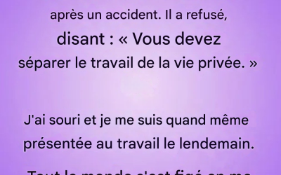 Une réponse calme qui a changé tout un lieu de travail Lorsque mon fils Liam a été transporté d'urgence à l'hôpital après un grave accident, tout le reste dans ma vie est passé au second plan.