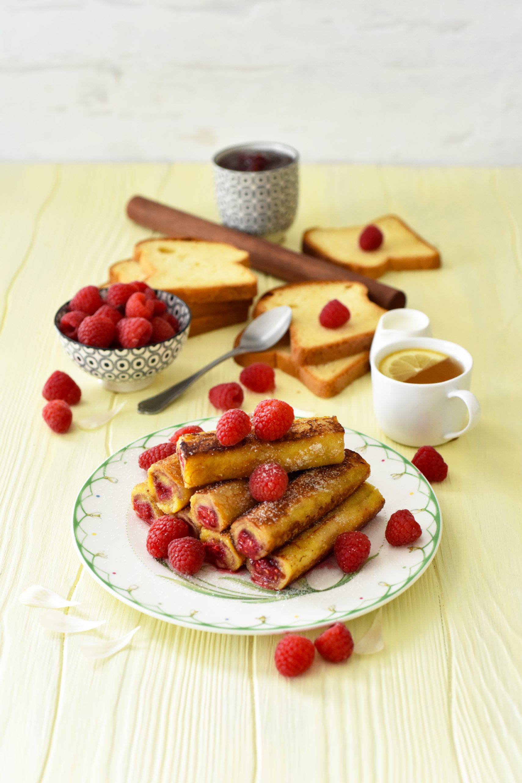 Des tranches de brioche imbibées d’un mélange onctueux, garnies de framboises fraîches et roulées avant d’être dorées à la poêle. Un dessert réconfortant et fruité !