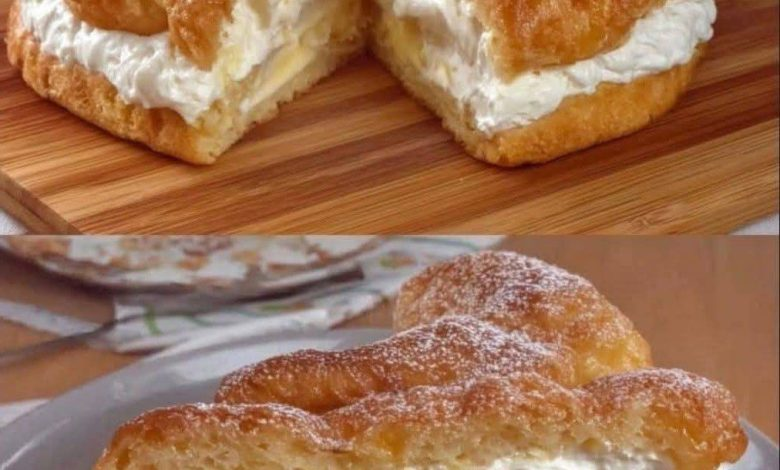 Ce dessert français élégant, le Paris-Brest , est un anneau de pâte à choux cuite au four, souvent en forme de roue de vélo, fourré d'une riche crème pâtissière et de crème fouettée légère.