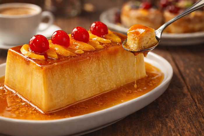 Pouding aux pêches au sirop