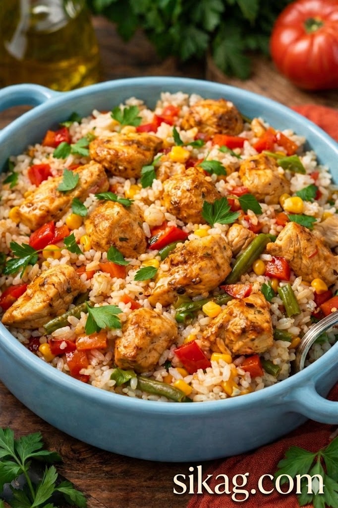 Catégorie : Plats à base de rizIngrédients pour préparer du riz au poulet et aux légumes