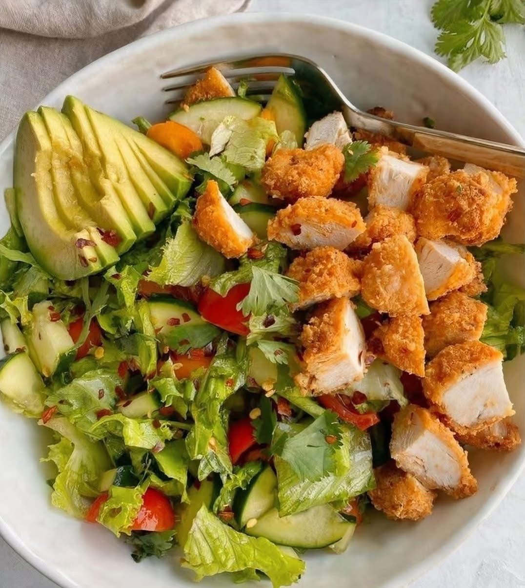 Une salade savoureuse et rassasiante qui associe du poulet croustillant doré, de l'avocat crémeux et des légumes frais – parfaite pour un déjeuner copieux, un dîner léger ou une recette qui sort de l'ordinaire.