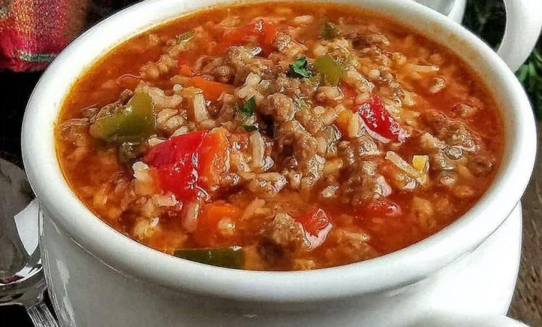 Cette soupe de poivrons farcis express reprend toutes les saveurs réconfortantes des poivrons farcis classiques — bœuf savoureux, riz tendre et une onctueuse sauce tomate — et les transforme en un plat copieux et facile à déguster. Bien plus rapide à préparer que de farcir et de cuire des poivrons individuellement, elle n'en offre pas moins ce goût si familier.